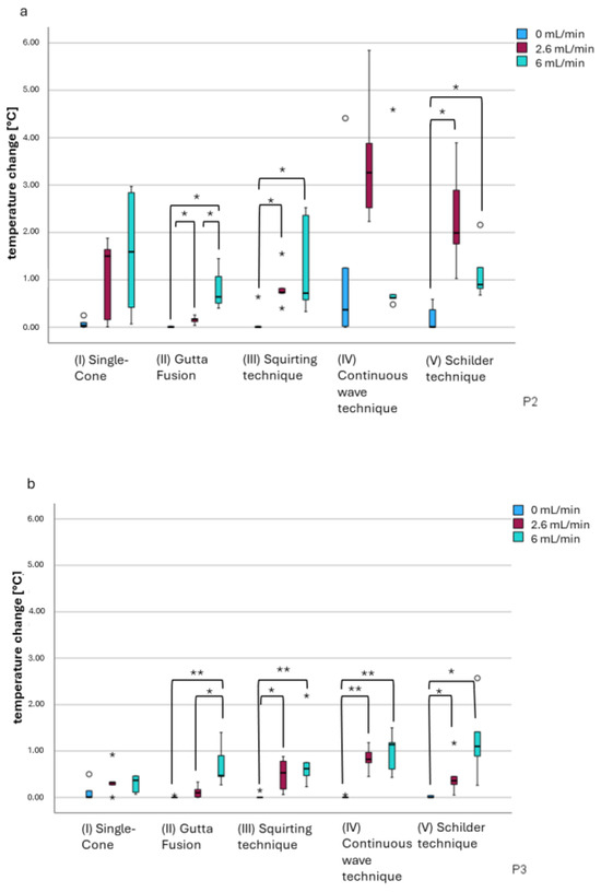 (a) Box plots for P2: temperature changes in the middle third of the root relative to the fluid circulation rate. (b) Box plots for P3: temperature changes in the apical third relative to the fluid circulation rate. Asterisks between boxplots * represents a p-value < 0.05, whereas ** represents a p-value < 0.01; ° represents outliers 1.5 to three times the interquartile range, asterisks above the boxplots represent distant outliers.