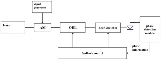 The system design introduces a feedback loop based on a PID (Proportional-Integral-Derivative) control algorithm to calculate the phase compensation feedback value []. This feedback value is then converted into control commands for the fiber stretcher and optical delay line, which are transmitted to the corresponding devices. This design ensures that the system’s long-term phase drift is controlled at the femtosecond level, achieving high-precision phase-stable transmission. The system architecture based on the above design is shown in Figure 1. In this figure, AM refers to the Analog Modulator, where the high-frequency reference signal is modulated onto the laser carrier. The ODL, or Optical Delay Line, serves as a device for coarse phase adjustment of the signal.