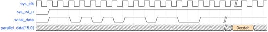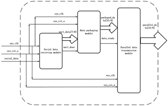 For the data interface conversion module, we employ the Xilinx Artix 7 series FPGA (AMD, Santa Clara, CA, USA), specifically the model XC7A35TFGG484-2. The design of the interface conversion module mainly includes a serial data reception module, a data packaging module, a parallel data transmission module, and circuits for clock, power, and reset. The overall block diagram of the FPGA conversion module system is shown in Figure 3, implemented using Verilog.