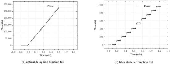 The functional test algorithm for the optical delay line is set to begin from an initial phase of 0, with a delay increase of 1 picosecond every 2 s until a total delay of 28 picoseconds is reached. For the fiber stretcher’s functional test, the algorithm starts with the phase of the high-frequency reference signal at 0, increasing the delay by 100 femtoseconds every 5 s until it reaches 900 femtoseconds. The test results, as shown in Figure 6, are consistent with expectations.