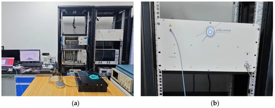 A timing system prototype has been developed based on structural divisions, as illustrated in Figure 8. In particular, Figure 8a depicts the physical prototype of the timing system, while Figure 8b presents the schematic representation of the continuous-wave laser unit. The fiber length is 0.5 m, and the frequency of the high-frequency reference signal is 499.8 MHz.