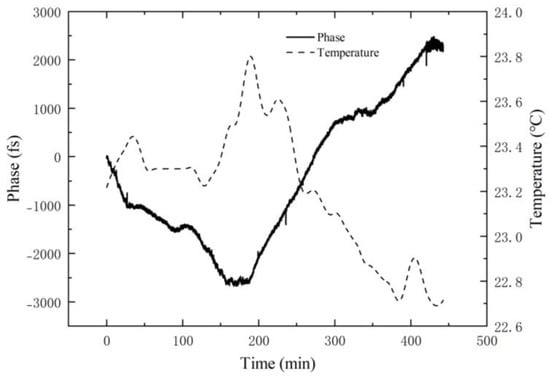 In the absence of the phase correction module and algorithms, the phase delay of the high-frequency reference signal and the ambient temperature over time are shown in Figure 9. From the figure, it can be observed that after 8 h of continuous testing, the temperature fluctuation reached 1 °C, under which the maximum phase offset was 2484.75 fs, with an average offset of 1374.104 fs.