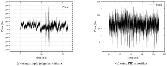 Figure 10 compares the performance of the simple conditional control algorithm with the PID control algorithm. It is evident that without the PID algorithm, the fluctuations in the signal phase were considerable, and the adjustment amplitude was quite pronounced. In contrast, after implementing the PID control algorithm, the signal changes became smoother, and the adjustment process exhibited greater stability.