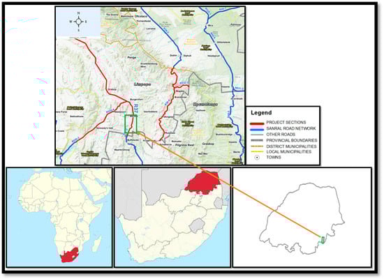 Geographically, the study points along the R37 road are located approximately 15 km south of Burgersfort town in the Sekhukhune District Municipality of Limpopo Province. The region of investigation is confined within the green demarcation, as shown in Figure 1. The topography of the study area is dominantly steep hilly or mountainous terrain [22]. The region is reported to experience a semi-arid climate with hot summers and mild winters. Historically, the region has seen periods of drought and inconsistent rainfall, influencing agricultural productivity, according to [23,24]. Over recent decades, climate change has exacerbated weather extremes, with more frequent heatwaves and shifting rainfall patterns [24]. The area’s water resources are heavily reliant on seasonal rains, making it vulnerable to prolonged dry spells. Mining is a centric economic driver in the region, with large-scale operations from companies like Samancor Chrome and Platinum Mines influencing the region’s infrastructure and development.
