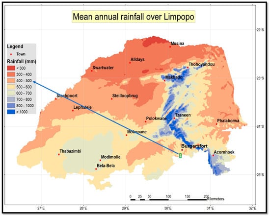 Mean annual rainfall variability in Limpopo province, modified from [24].