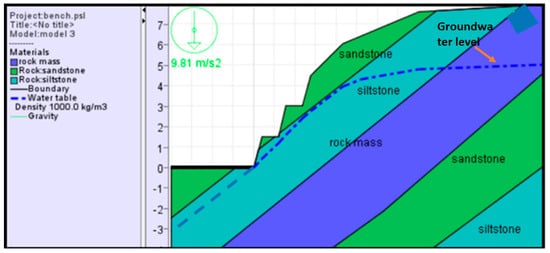 The modelling process in FLACSlope, as described on the Itasca Consulting Group website, follows a structured approach. The procedure begins by defining the project, which includes configuring the project file, slope parameters, and model layout. After setting up the project, the model is built by defining the slope’s layers, with the material properties inputted for each layer (see Figure 5 for an example of the built model). These details are crucial for simulating slope behaviour under varying conditions. In this analysis, the layers were adjusted based on the specific properties of the slopes, as outlined in Table 2. To ensure accurate results for the Factor of Safety (FoS) calculations, a fine-grid model was selected. The water table was raised incrementally, based on regional rainfall data, to model various hydrological conditions. While the water table values fluctuated, the material properties of the layers remained constant throughout the simulation. The model then produced key outputs, including FoS, strain, and pore pressure contours. For normal (sunny) conditions, a water table volume of 1000 m3 was used, while rainy conditions were modelled with a water table of 2500 m3 (as documented in Table 2, which includes the input parameters applied for the model). This allowed for a comparison of slope stability under different environmental scenarios. In terms of boundary conditions, Flacslope follows the upper bound theorem, which states that “Collapse must occur if, for any compatible plastic deformation, the rate of working of the external forces on the body equals or exceeds the rate of internal energy dissipation” (after Davis and Selvadurai [31]). The previous statement would mean that the compatible plastic deformation, which clearly indicates that any deformation that can satisfy all displacement boundary conditions, is possible kinematically based on the flow rule which governs admissible dilation.