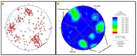 Distribution of kinematic data: (a) pole plot; (b) contour plot with six sets and toppling susceptibility region for the selected study area.