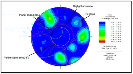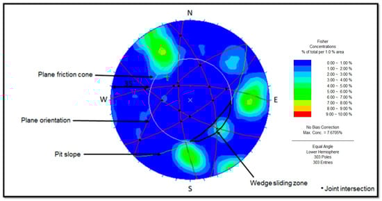 It is well established that plane failure occurs in rock slopes when certain geometric circumstances are fulfilled. It is documented by [33] that plane failure develops with the following circumstances: (a) “the strike of the joint planes on the sliding has a strike orientation parallel within ± 20° to the slope strike”, (b) “the dip of joint plane must be less than the slope angle”, (c) “the dip of the joint should be greater than the friction angle”, and (d) “the upper part of the sliding surface must either intersect the upper slope or terminate in a tension crack” (see Figure 9). However, the results documented in Figure 8 support the suggestions governing the planar failure; as such, it is concluded that planar failure may be expected as well.