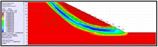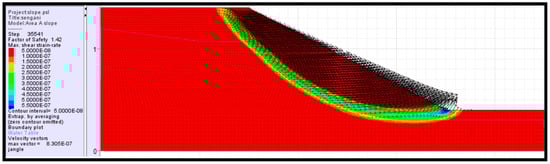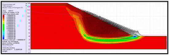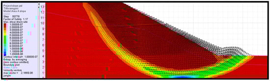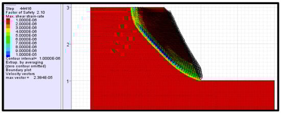 The analysis has revealed that the occurrence of simultaneous toppling and sliding modes is an attribute of steep slope angles. The presence of multiple joint sets also contributes to the instability occurrence and susceptibility. The results of the analysis correlate very well with the discussion outlined under observations. Furthermore, the result of this analysis also correlates very well with some of the well-established studies in slope stability, such as [33,34,35], among other authors’ work. Toppling has been revealed to occur due to the presence of blocks with heights exceeding their base length on steep inclination surfaces. It is equally important to understand all the mechanisms that promote slope failures, which are not presented in kinematic analysis. The next section outlines the stability analysis of the slopes using numerical simulation (FLACSlope).