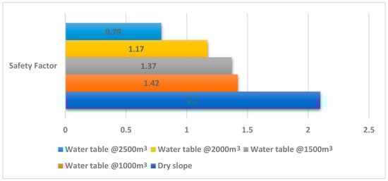 The FLACSlope results are further represented graphically to assess the relationship between FoS and water presence (see Figure 17). Indeed, the relationship is observed to be proportional, implying that an increase in water volume on the slope results in saturation and phase transition, especially on the unconsolidated top layers of the slope, drastically reducing the Factor of Safety. A water volume increment increased the failure susceptibility by promoting the magnitude of shear stress over shear strength, as it is noted that the highest FoS obtained was for dry slope conditions, and the lowest FoS of 0.79 represents 2500 m3 of water (wet conditions).