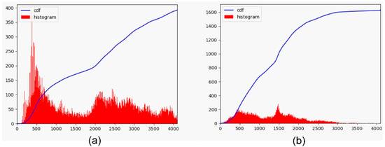 Figure 3 demonstrates the histograms and CDFs of 12-bit EDR and HDR images, respectively. From the histogram of the EDR image, dark areas accumulate a large number of pixels, resulting in low contrast in the areas. The histogram of the HDR image is relatively flat and spreads out a wider range of pixel intensities to provide better contrast and details. Therefore, if we can change the pixel distribution of an EDR image such that its histogram is similar to the histogram of an HDR image, we can generate an HDR image with good contrast and details.