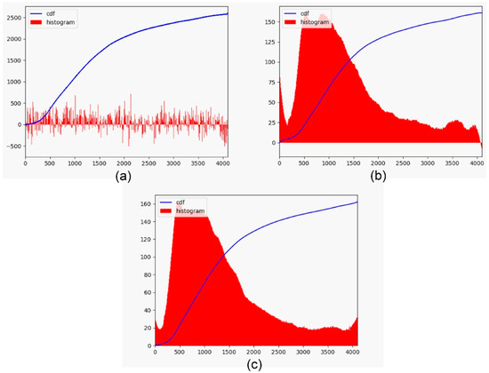 Figure 4a is the original output CDF and the corresponding histogram. The accumulation curve smoothed by the Savitzky–Golay filter and its image histogram are shown in