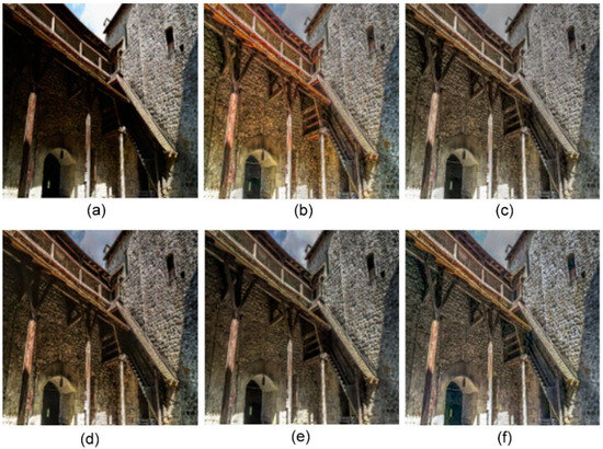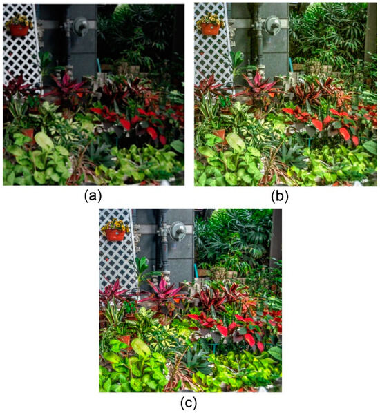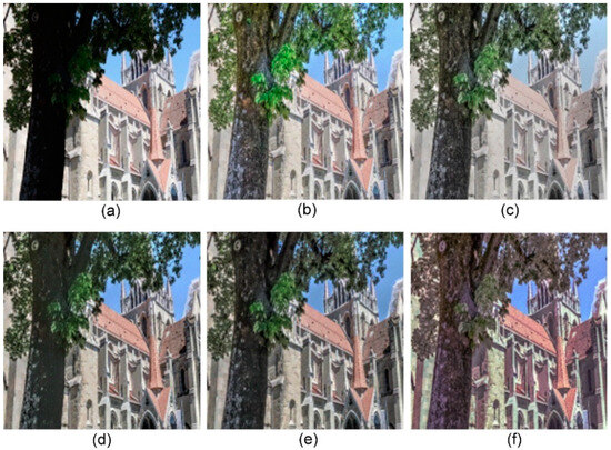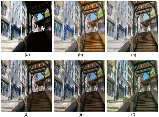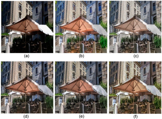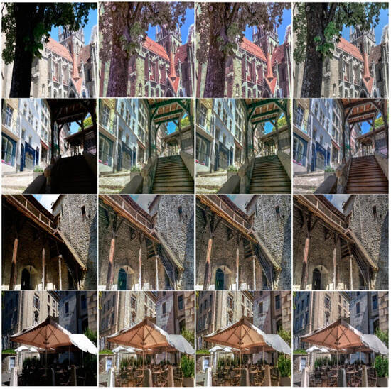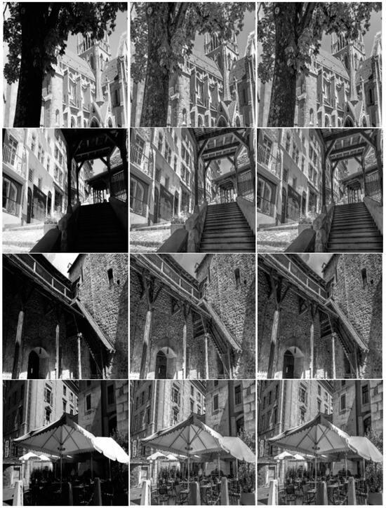 Figure 7, the original images were partially underexposed, resulting in the loss of detailed textures. For example, the tree trunks in the first image, the stairs in the second image, building shadows in the third image, and the shadows under the parasols in the fourth image. All these difficult-to-identify details were greatly improved by the proposed technique, as shown in the middle column images of