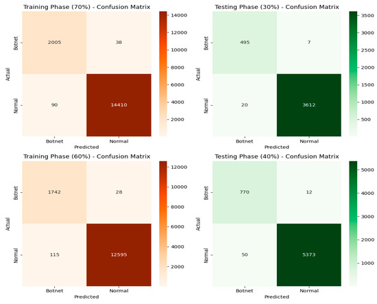 In Figure 1, the confusion matrices highlight the classification performance of the GA-HDLAD approach for both 70:30 and 60:40 TRPH/TSPH splits. The results show that the model accurately distinguishes between botnet and normal traffic in both the training and testing phases. The matrices illustrate that the GA-HDLAD model achieves high accuracy with very few misclassifications for both botnet and normal samples across different data splits. These results confirm the model’s strong capability in detecting botnet traffic while maintaining low error rates, making it a reliable tool for IoT anomaly detection.