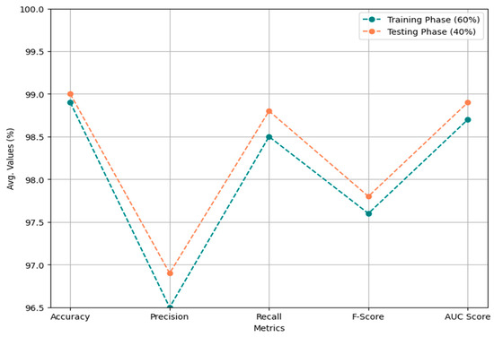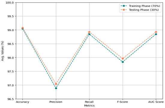 Table 4 and Figure 3 present the detailed results of the anomaly detection capability test using a 70:30 split of the TRPH/TSPH data. The GA-HDLAD method demonstrates its effectiveness in identifying both normal and botnet samples. With 70% of the TRPH data, the approach achieves an average accuracy of 99.03%, precision of 96.84%, recall of 98.80%, F-score of 97.80%, and AUC score of 98.82%. This high accuracy indicates that the model performs well in classifying both normal and botnet traffic, showing minimal misclassification. For the 30% TSPH data, the model’s results show an even higher accuracy of 99.06%, precision of 96.99%, recall of 98.90%, F-score of 97.92%, and AUC score of 98.90%, further validating the robustness of the GA-HDLAD approach across different dataset splits. These results, presented in Table 4, highlight the model’s strong performance across multiple key metrics, clearly demonstrating its reliability in detecting anomalies in IoT traffic.