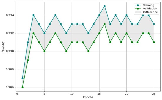 SA was applied iteratively to adjust these parameters in a way that balances model accuracy and generalization while minimizing overfitting. The objective was to reduce the classification error rate, as represented by the fitness function in Equation (9). By using SA, the hyperparameters were fine-tuned more efficiently than traditional methods such as grid search or random search, which are computationally expensive and may miss the global optima. SA’s stochastic nature allowed for a more thorough exploration of the hyperparameter space, improving the model’s stability and performance.