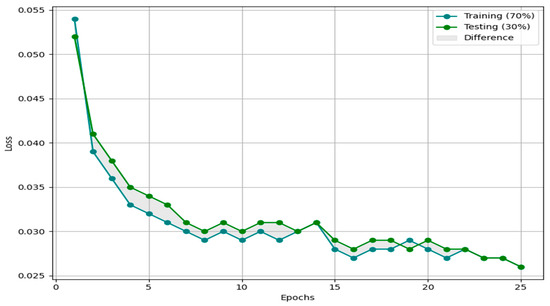 The TES and TRA loss values at 70:30 of the TRPH/TSPH across different epochs are shown in Figure 5. The TRA loss indicates a reduction in the model loss, which can be used to modify the weight to minimize the classifier error in the TES and TRA data. The figure shows that the TRA and TES losses are steadily reduced, and also indicates that the GA-HDLAD algorithm is able to effectively learn the patterns in the TES and TRA data. The method is able to adapt the parameters to reduce the variance between the predictions and actual training labels.