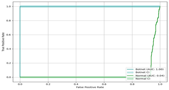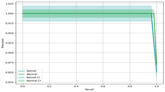 Figure 6 presents the precision–recall (PR) analysis of the GA-HDLAD algorithm using the 70:30 TRPH/TSPH split. The curve demonstrates high precision and recall values for both botnet and normal traffic classes, indicating the model’s strong capability to accurately identify true positives while maintaining a low rate of false positives. The confidence intervals (CIs) around the PR curves further illustrate the model’s consistency across different samples, with both the botnet and normal classes achieving near-perfect precision and recall. The high PR values confirm the model’s ability to accurately detect botnet traffic with minimal false positives. The tight CIs reflect the stability of the GA-HDLAD method, reinforcing its effectiveness in maintaining high precision and recall for reliable IoT anomaly detection.