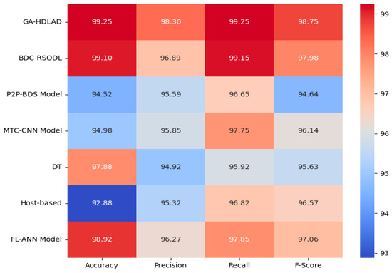 Table 5 and Figure 8 provide details of the comparison between the proposed algorithm and other systems [53,54]. As can be seen from the experimental values, worse outcomes are achieved using the host-based method. In addition, the MTC-FET and P2P-BDS methods are found to increase the performance to some extent, with the FL-ANN and DT methods achieving moderate performance. While the performance of the BDC-RSODL model is significant, it is not as efficient as the GA-HDLAD model, which exhibits a maximum accuracy of 99.25%, precision of 98.30%, recall of 99.25%, and F-score of 98.75%. Hence, the GA-HDLAD algorithm is the best approach for use in the automated detection of botnets in IoT systems.