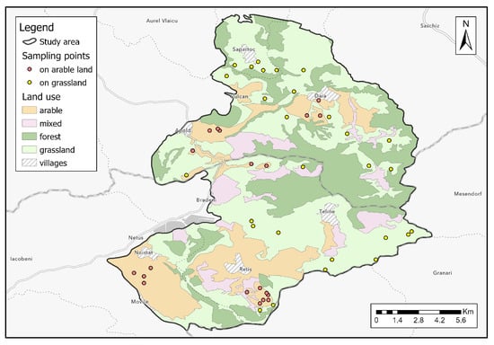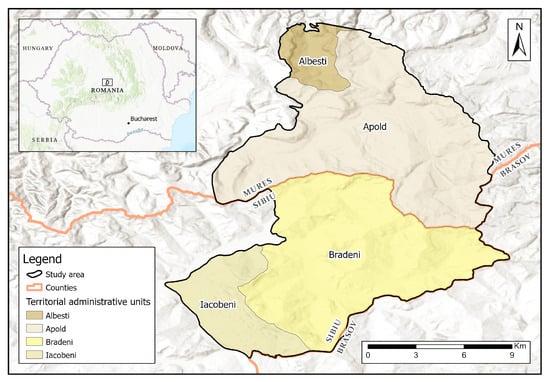 The study area is situated in the Târnava Mare region of the Transylvanian Basin, located in central Romania (Figure 1). This area was delineated based on three key criteria: (i) the selection of a region that is representative of a traditional Romanian cultural landscape; (ii) the identification of administrative units that include both arable land and grassland, where land use has remained stable for a minimum of ten years; and (iii) the selection of an area encompassing three distinct soil classes—Cernisoils, Hidrisoils, and Luvisoils, as defined by the Romanian Soil Taxonomy System [26]—with each being present in both grassland and arable land. The administrative units fulfilling these conditions are Albesti, Apold, Bradeni, and Iacobeni, located within Mures and Sibiu counties.