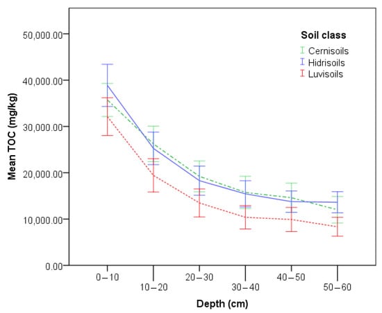 A repeated measures ANOVA was applied to evaluate the relationship between soil class and sampling depth, and the results show that the decreasing pattern of the TOC amount was nearly similar for all investigated soils. No significant effect was observed for soil class (p = 0.33, df = 2) or for the interaction between soil class and the sample’s depth (p = 0.86, df = 4.2) (Figure 3).