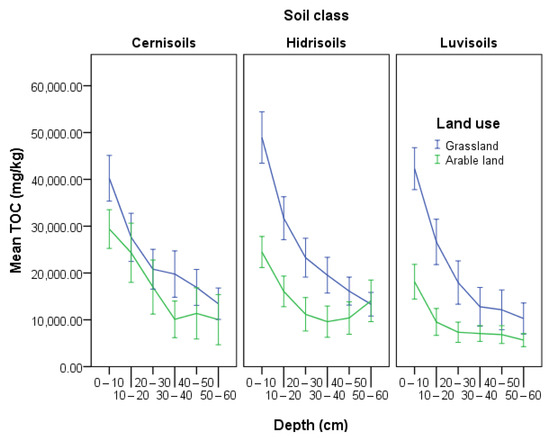 Regarding soil depth, the existing literature generally shows a decreasing trend in SOC with depth in undisturbed areas [54,55]. In our study, this trend was observed in grasslands but not in arable lands. In arable soils, the TOC showed a notable decrease with depth, up to approximately 30 cm, across all three soil classes, followed by either a slight increase (in Cernisoils and Hidrisoils) or stagnation (in Luvisoils), as shown in Figure 4. This disruption is likely a result of ploughing, which typically occurs at depths of around 30 cm, redistributing organic matter. Additionally, factors such as the soil texture [56], root depth [57], water availability, and water movement through the soil profile [58] may influence the vertical TOC distribution [59].