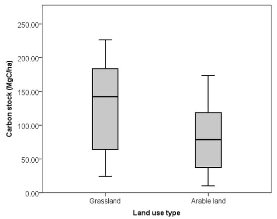 The carbon stock of arable lands had a median value that was 45% lower than the measured value in the grasslands, a difference which was found to be statistically significant (p < 0.01) (Figure 5).