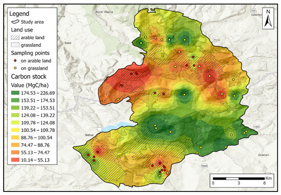 The lower carbon stock values observed in certain grassland sampling points (Figure 6) may be attributed to overgrazing, which reduces the biodiversity and, subsequently, SOC content [42]. Additionally, uncontrolled and intensive grazing likely contributed to soil compaction in these areas, further reducing SOC levels [5]. In contrast, grasslands that were less affected by grazing, where the plant biodiversity was higher, demonstrated the greatest carbon stock values. These regions exhibited more abundant root biomasses and stable soil structures, both of which led to increased SOC levels. In arable lands, the lowest carbon stock values were recorded in areas with corn and forage crops, while higher carbon stock was associated with intermediate crops or arable lands fertilized with organic materials. These results, in line with [11,43], underscore that land use and agricultural management practices significantly influence SOC stocks in agricultural landscapes.