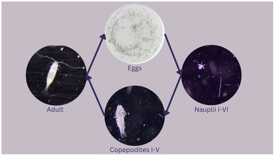 After reaching copepodite stage I, the cultures were moved to a temperature-controlled room at 20 ± 2 °C. The cultures were observed as they progressed to copepodite I- V and the adult stage (Figure 1) by microscopic analysis every 3 days.