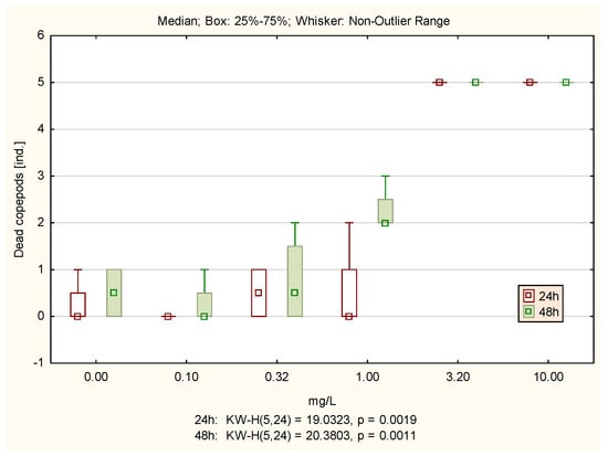 The box plot illustrates mortality trends across different toxicant concentrations, showing a stronger response at 48 h, with significant differences confirmed by the Kruskal–Wallis test and p-values < 0.05 for both time points, emphasizing the significant differences between the toxicant’s dose- and time-dependent impact (Figure 2). In the control group, copepod mortality remains consistently low over 24 and 48 h. At lower concentrations of 3,5-dichlorophenol (0.1 mg/L and 0.32 mg/L), mortality gradually rises, with minor time-dependent variations. At an intermediate concentration (1 mg/L), mortality increases more notably, particularly after 48 h, indicating a potential delayed or accumulative effect. At higher concentrations (3.2 mg/L and 10 mg/L), mortality reaches its maximum within both time frames (Figure 2).