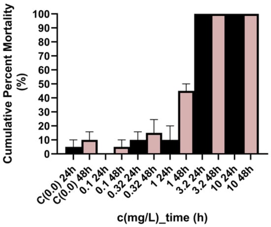 In the control group C (0.0), mortality is low, indicating that environmental factors likely did not cause significant death and validating the experiment (Figure 3). As the concentration increases, mortality gradually rises, with more pronounced effects at 48 h, suggesting time-dependent toxicity. At higher concentrations (3.2 and 10 mg/L), mortality reaches 100%, indicating that these concentrations are lethal to copepods within 24 h. (Figure 3). The error bars (SEM) reflect variability in the data, showing that while some variation exists, the trends are consistent and indicate dose-dependent mortality (Figure 3). This suggests that the substance is toxic to copepods in a concentration- and time-dependent manner.