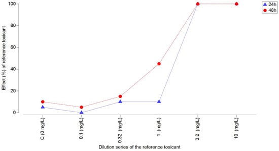 Increasing concentrations of the toxicant result in progressively greater effects over time. The highest concentration (10 mg/L) caused maximal effect at 24 h, while lower concentrations show milder effects, with some increasing over time (e.g., 1 mg/L). The control group, as expected, shows a negligible effect (Figure 5).