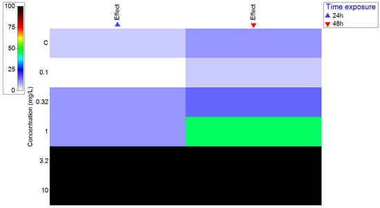 Concentrations of 3.2 mg/L and 10 mg/L exhibited high effects across both time points (24 h and 48 h) showing a significant effect, with colors moving towards black, indicating 100% effect (Figure 6). Conversely, concentrations 0.1 mg/L and C (control) showed low effects, suggesting that the 0.1 mg/L concentration does not significantly differ from the control. The 0.1 mg/L concentration effects remained consistently low across both time points. A notable time-dependent change was observed for the concentration of 1 mg/L, which transitioned from a lower effect at 24 h to a higher one at 48 h, indicating that this concentration is a threshold where the substance starts to have a notable impact (Figure 6).