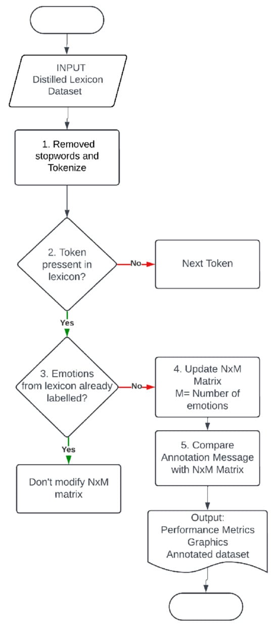 This process extracts and categorizes unique tokens from the preprocessed messages. Instead of considering the frequency of each token, lexicon distillation classifies tokens based on their association with specific emotions. The process involves several necessary steps: