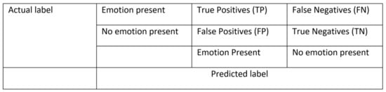 Subsequently, confusion matrices were calculated for each emotion and threshold. A confusion matrix is a tool used to evaluate the performance of a classification task [7,11,55]. It is divided into four segments: