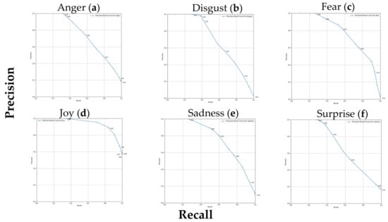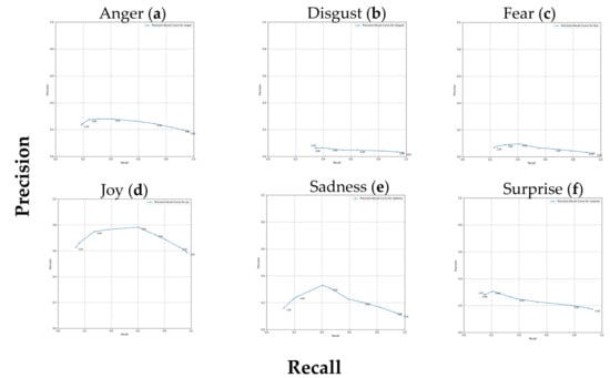 Precision–recall curves for six different emotions analyzed using the GoEmotions distilled lexicon and applied to the GoEmotions dataset. Each graphic represents the precision–recall curve for a specific emotion, with points on the curve representing different thresholds. Emotions include (a) anger, (b) disgust, (c) fear, (d) joy, (e) sadness, and (f) surprise.