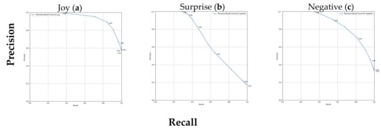 Conversely, Figure 9 illustrates the precision–recall curve for the GoEmotions Aggregated distilled lexicon applied to the XED Aggregated dataset. In this scenario, the curve demonstrates an improvement in model performance, as evidenced by higher recall values and precision for the aggregated negative emotions (see Figure 9c).