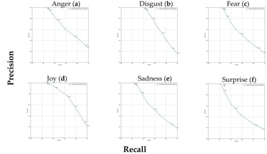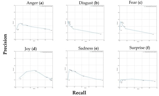 Precision–recall curves for six different emotions analyzed using the GoEmotions distilled lexicon and applied to the XED dataset. Each graphic represents the precision–recall curve for a specific emotion, with points on the curve representing different thresholds. Emotions include (a) anger, (b) disgust, (c) fear, (d) joy, (e) sadness, and (f) surprise.