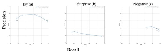 Precision–recall curves for three different emotions analyzed using the GoEmotions Aggregated distilled lexicon and applied to the GoEmotions Aggregated dataset. Each graphic represents the precision–recall curve for a specific emotion, with points on the curve representing different thresholds. Emotions include (a) joy, (b) surprise, (c) negative.