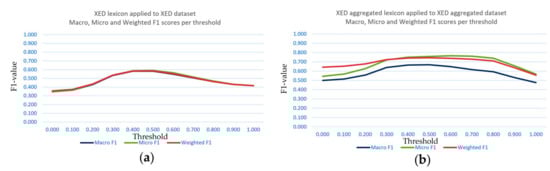 The weighted F1-score demonstrates that it is sensitive to the presence of more labeled tokens in the lexicons, which can be seen in the lower thresholds, and this might explain the higher values that it shows at lower thresholds. However, when applied to the XED dataset, the weighted F1 performs comparably to the macro F1-score. As can be seen in Table 2, the XED dataset is balanced. This trend in the weighted F1-score changes with the aggregated XED dataset, where negative emotions are combined into a single class, thus skewing the class balance. Under these conditions, at lower thresholds, the weighted F1 shows better performance. It is also a metric that is responsive to changes in class balance and, in this case, word availability.
