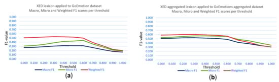 Figure 16a for the GoEmotions distilled lexicon applied to the GoEmotions dataset presents a lower macro F1. In the case of the weighted F1, the lower thresholds show a higher value; then, for the higher value thresholds, the micro F1 has higher values (see Table 6). This performance pattern is mirrored in the results from the GoEmotions aggregated lexicon applied to the aggregated GoEmotions dataset, shown in Figure 16b and Table 6. Similar trends across the macro, micro, and weighted F1-scores are observed here. This underscores the impact of lexicon and dataset configuration and how aggregating the negative emotions in one class, as well as having a more balanced dataset, has an impact on the effectiveness of different F1 scoring methods.