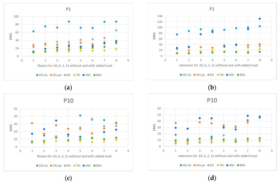sEMG data from Delcla, Delspi, BIC, TRI, ANC, and BRA for eight different flexion (a,c), and extension phases (b,d) for two participants—P1 and P10.
