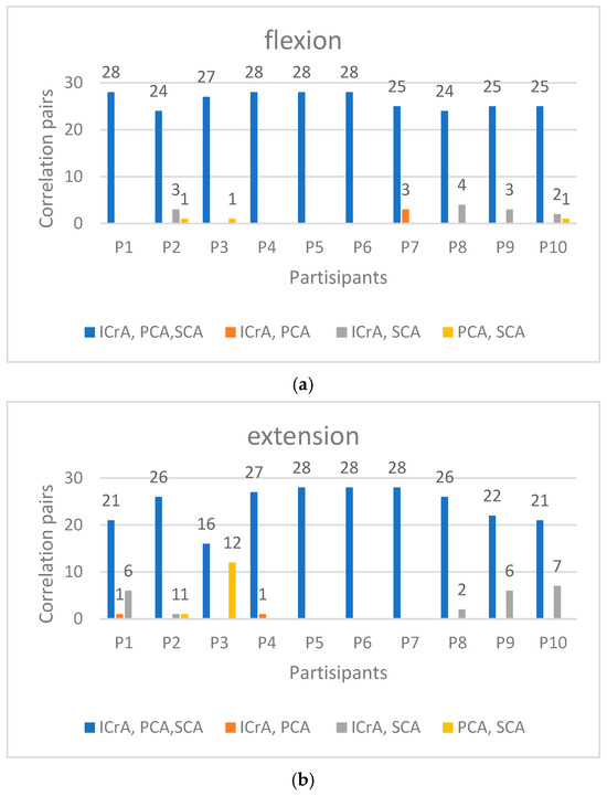 When the differences in the results of the three algorithms are discussed, the ICrA and SCA outcomes matched 34 correlation pairs (12 for flexion and 22 for extension). The matching results for PCA and SCA were found for sixteen correlation pairs, while for ICrA and PCA, they were only five. Again, it can be concluded that ICrA and SCA are more similar in evaluating results in comparison to ICrA and PCA, and PCA and SCA.