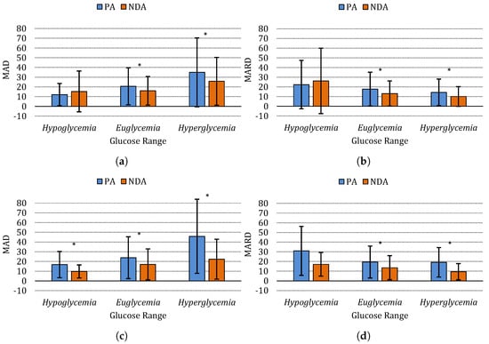 MAD and MARD values during PA and NDA for different glycemic ranges for (a,b) Eversense against FSLCstrip and (c,d) FSL against FSLCstrip. MAD and MARD were calculated based on the differences between glucose values recorded by the CGM device and FSLCstrip for PA and NDA, respectively. The comparison highlights whether there are significant differences between the PA and NDA conditions across glucose ranges. * indicates statistically significant differences in the impact of physical activity according to the two-proportion z-test (with level of significance of 0.05).
