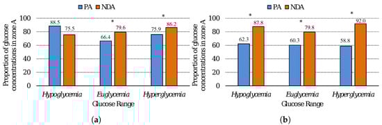 Proportion of glucose concentrations in zone A of CEG by considering different glucose ranges (hypoglycemia, euglycemia, hyperglycemia) and PA and NDA for (a) Eversense and (b) FSL. * indicates statistically significant differences in the impact of physical activity (PA versus NDA) according to the two-proportion z-test (with level of significance of 0.05).