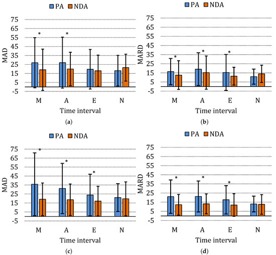 MAD and MARD values during PA and NDA for different time intervals for (a,b) Eversense against FSLCstrip and (c,d) FSL against FSLCstrip. MAD and MARD were calculated based on the differences between glucose values recorded by the CGM device and FSLCstrip for PA and NDA, respectively. The comparison highlights whether there are significant differences between the PA and NDA conditions across glucose ranges. * indicates statistically significant differences in the impact of physical activity according to the two-proportion z-test (with level of significance of 0.05).