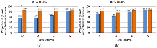 Proportion of glucose concentrations in zone A of CEG by considering different time intervals (, , , ) and the periods PA and NDA for (a) Eversense and (b) FSL. * indicates statistically significant differences in the impact of physical activity (PA versus NDA) according to the two-proportion test (with level of significance of 0.05).