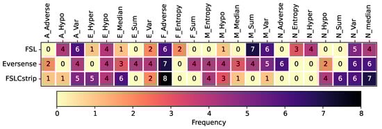 The extraction process results in a total of 35 features, 7 features for each time interval (, , , ), and 7 considering glucose data during all day. We also conducted a correlation analysis using the Pearson correlation coefficient (PCC), aiming to discard those features highly correlated (with a PCC over 0.7). As a result, 15 features were kept for FSLCstrip, 16 for Eversense, and 15 for FSL. Then, we used several filter, wrapper, and embedded FS methods to select the most important features. Given that several FS methods were considered, a voting strategy was conducted for selecting the most representative features, keeping those features chosen by at least three of the eight FS methods. Figure 6 shows the voting results of the eight FS methods, which indicates the frequency of selection of each feature for different BG monitoring devices studied in the paper. A total of 11 features were selected for FSLCstrip (F_Adverse, N_Median, N_Sum, N_Var, E_Median, A_Var, E_Hyper, N_Hypo, M_Entropy, M_Hypo, E_Hypo), 14 for Eversense (F_Adverse, N_Median, N_Var, N_Adverse, M_Var, M_Entropy, E_SumValues, E_Var, F_SumValues, A_Var, M_Hypo, E_Hypo, M_Median, E_Median), and 10 for FSL (M_SumValues, A_Var, F_Adverse, M_Var, N_Var, A_Hypo, N_Hyper, N_Median, E_Hypo, N_Entropy). As shown in Figure 6, F_Adverse, N_Median, N_Var, A_Var, and E_Hypo are the features most voted for. F_Adverse indicates the presence of a glycemic event by considering all glucose values, while E_hypo denotes the episodes of hypoglycemia during the evening (). N_Median, N_Var, and A_Var are statistics from the time series that point out the variance and median of glucose values in the interval and .