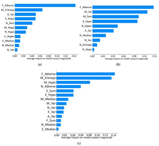 SHAP bar plots showing the importance of each feature for predicting PA and NDA, using (a) FSLCstrip and SVM; (b) Eversense and LR; and (c) FSL and LR.