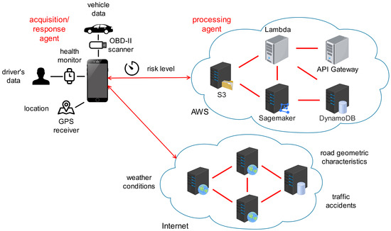 Our system is based on in-vehicle and infrastructure domains. The in-vehicle domain consists of Onboard Units (OBUs) and Application Units (AUs) installed in the vehicles, and the infrastructure domain consists of vehicles equipped with OBUs and AUs that can communicate with external networks through Roadside Units (RSUs). This system uses Amazon Web Service (AWS) services for storage, processing, model training, and deploying information. This system consists of three components or modules called agents. Those agents are built on vehicular scanners, Global Positioning System (GPS) receptors, heart rate and oxygen saturation monitors, cloud services, and mobile apps. Figure 1 presents the architecture of the Risk Level Prediction System.